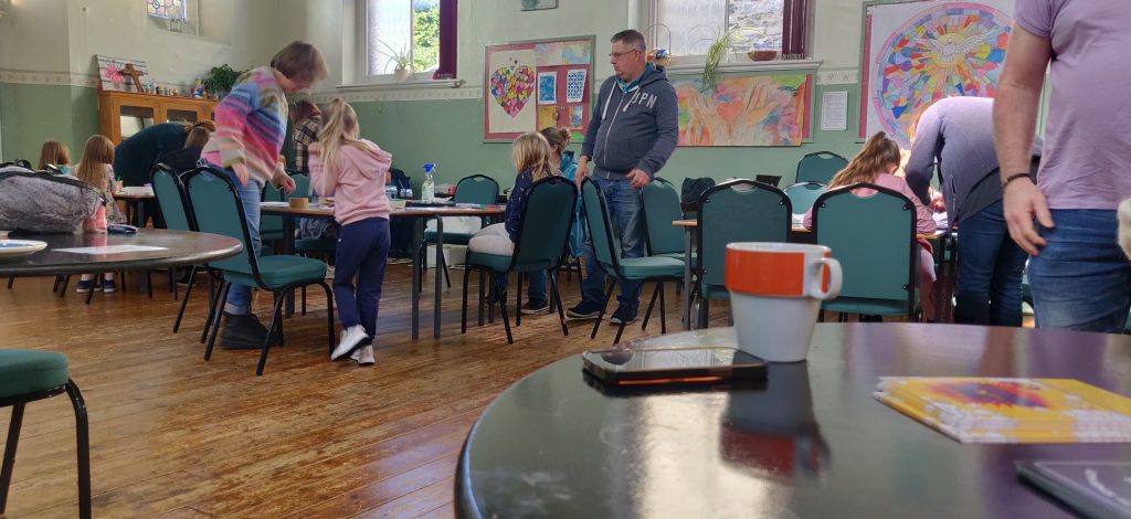 This morning, Sunday, was a cloudless day and beautiful blue skies (welcome over Skies would be blue wouldn’t they). Off to my Vineyard Church meeting, This is a Super Sunday meeting which means there is no actual service as such. Anyone is invited and also to bring along their children for a variety of games and past times. In the main meeting Hall there is a large bouncy castle and the children have a whale of a time.