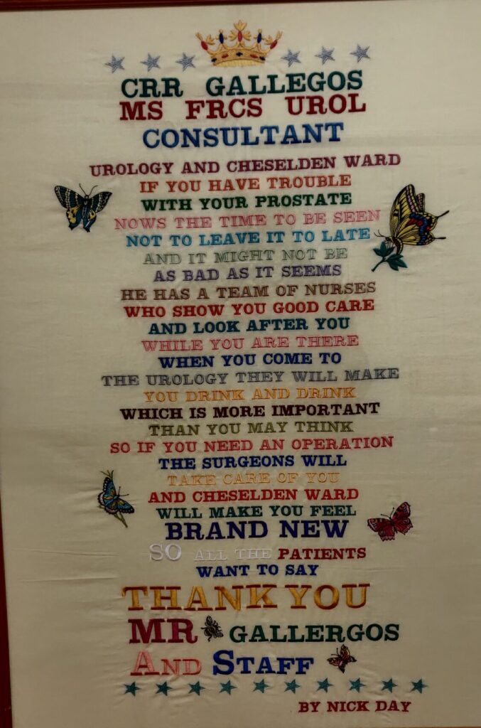 I had to go back today for a cystoscopy examination (bladder area) just to make sure that a previous condition had not deteriorated. On the wall I saw this lovely embroidered artwork by a Nick Day which I have never seen before and must be unique