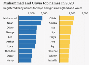 Approximately 60% of people named Mohammed live in the Middle East, North Africa and Pakistan. In the UK in England and Wales in 2023, Mohammed was the top choice for parents naming their baby boys. See chart.Â