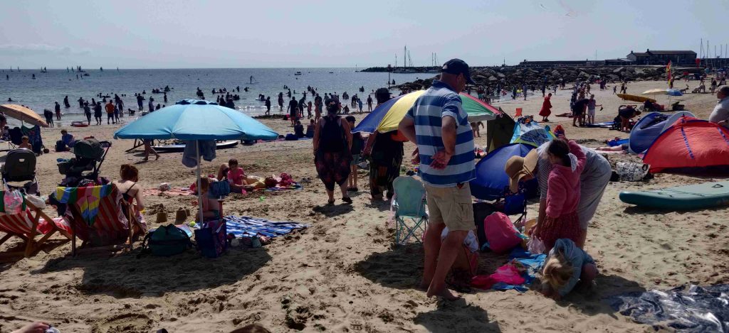 Today Wednesday Francoise felt strongly that she wanted to go to Lyme Regis and what a good decision that was. The weather was hot without being stifling, and the crowds were out in force. We jumped on the hourly bus from Bridport that runs along the coast and 50 minutes later we had arrived. The beach was full but actually it did not matter as everyone was in such a good mood. Francoise decided to have a swim, and why not, so I was quite happy to stand over our possessions while she did so.