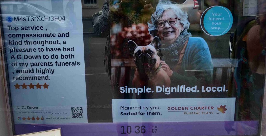 Next up was a funeral director’s office who had the clever idea of putting a video in the front window with subtitles thus answering most of the questions and concerns that people have. Some people are too shy to walk in the door so this is really a brilliant way of introducing the service and I went in and told them how good it was.Â
