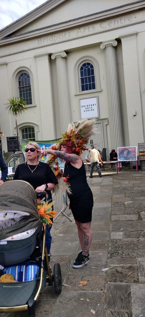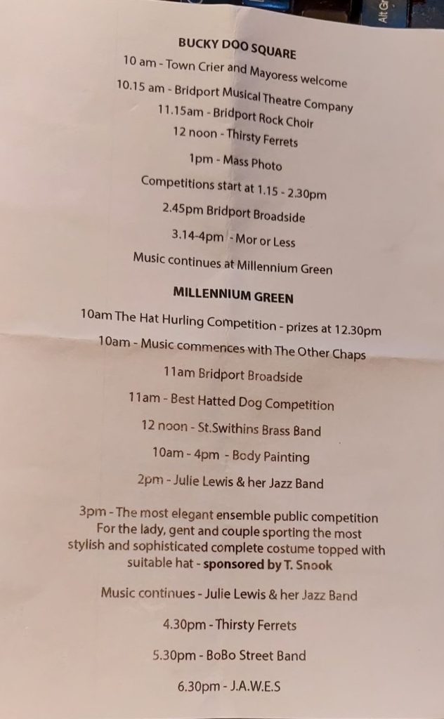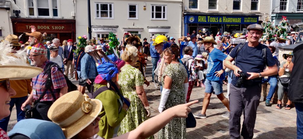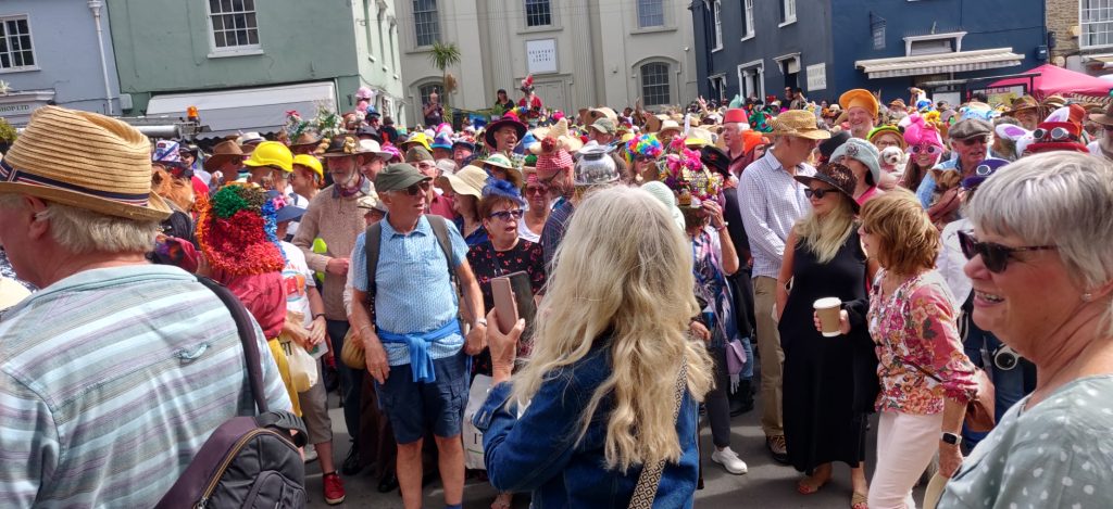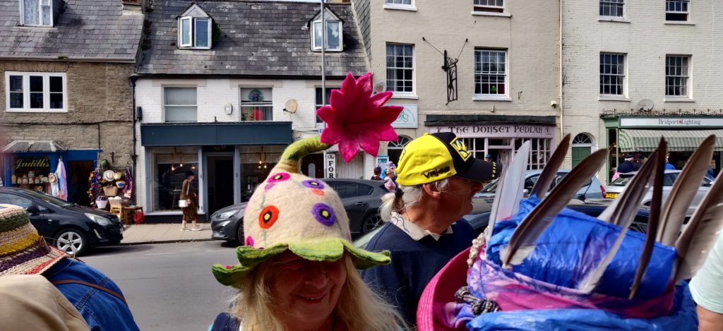 We got the impression that it has had its time, but nevertheless it is great fun to come along and see such a wide variety of hats as well as stalls. The local church was open for tea and coffee, and you could go out to the tower if you wanted. I don’t think we’ll go every year, but it will always be there in some form or another. If you want to see more pictures, then type in to Google ‘Bridport Hat Festival’